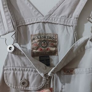 Vintage 90s Express Jeans Cotton Denim Straight Wide Leg Barn Chore Overalls in a light stone cream taupe color. Size medium. Perfect for casual outings or the upcoming spring and summer seasons.