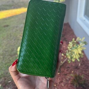 Stylish green woven leather wallet. Perfect for everyday use.