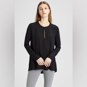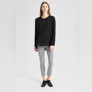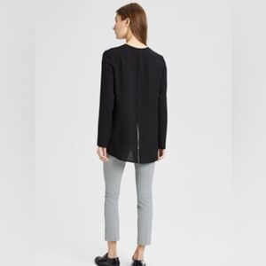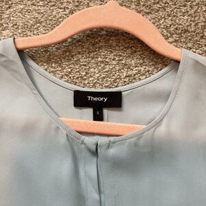 Theory Silk Slit Neck Tunic Light Blue (photos of this top in black are to show the cut and fit) Size Small In excellent condition Pickup in yeg available Keep it light and airy all spring long with this ethereal blouse from Theory! Made of 100% silk, this baby blue beauty is perfect for throwing on for any warm weather occasion. Pair with your favorite jeans and sandals for brunch or wear with a floral skirt and wedges for a backyard soiree. No matter how you style this top, you'll be styling and profiling! Size S 100% Silk Pullover Unlined Relaxed silhouette Round neckline w/ buttoned keyhole cutout Long sleeve Slit on back of hem Bust 40" Waist 38" Sleeve length 24" Shoulder to hem 26"