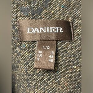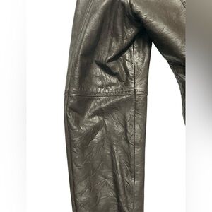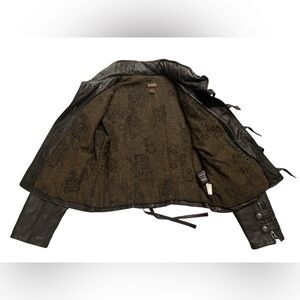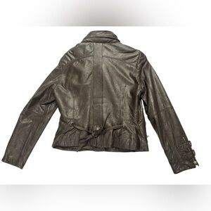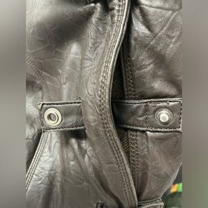 Vintage brown leather biker style jacket size large. This jacket is in used condition and does have wear to it and a very small hole on the arm(as pictured) so please examine it closely to ensure it is up to your standards. Very cool vintage tage piece from the early 2000’s made by danier leather company. Has a built in knit hood that can be put away when not in use in the collar, has u unique straps that feed through for closure and a lined inside(non removable). Can’t beat the price point !!