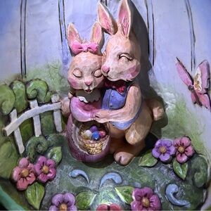Charming Easter egg figurine featuring adorable bunnies. Perfect for adding a touch of whimsy to your home decor. The vibrant colors make it a delightful centerpiece.
