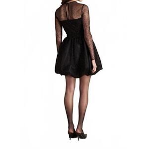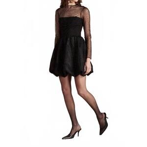 Elevate your wardrobe with the Saoirse Dress by SAYLOR, a sophisticated take on the classic little black dress. This stunning piece features long sleeves and a bubble hem crafted from dot mesh and crinkle combo fabric. Made from 100% polyester with a 100% recycled polyester lining, it includes a convenient side zipper and a shank button at the back of the neck. For the best care, dry clean only. Perfect for fall cocktail parties, this minimalist sheath dress exudes timeless elegance.