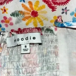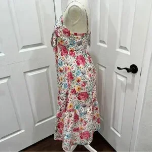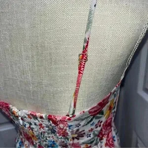 Description: Beautiful floral print zip back closure, midi dress with adjustable spaghetti straps and a tie closure at bust. Ruched elastic back for a butted top fit. Perfect little spring dress.