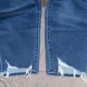 Trendy dark blue jeans with a distressed hem. Perfect for casual outings.