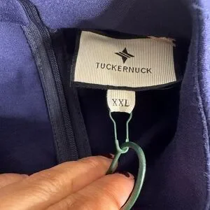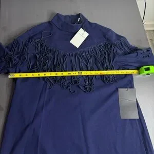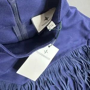 Tuckernuck dress navy blue shift style dress features a trendy mock neck and 3/4 length sleeves, center back entry zipper beautiful fringe detailing across the front and shoulders. The dress is crafted from a stretchy knit fabric that will hug your curves in all the right places, making it perfect for any occasion from travel to parties to casual outings.