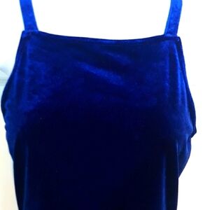 This is a. Very pretty velour type dress made from polyester and spandex in a beautiful blueish color. Form fit on top then falls loosely. Back is open with a gorgeous criss cross pattern which really gives the dress a sexy appeal. Size small. Measurements are approximately lying flat pit to pit 15" does have some stretch total length of dress only (not the spaghetti straps included in length )31". Excellent condition!!