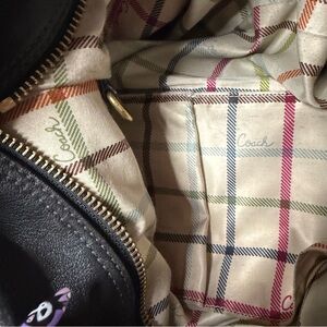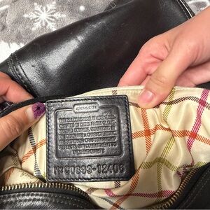 Style number C0893-12406. Features a zip-top closure, adjustable shoulder strap with buckle detail, and signature Coach plaid fabric lining. Soft, slouchy silhouette that sits comfortably on the shoulder.