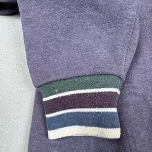 Vintage-style crewneck sweatshirt features a unique purple heathered fabric with a distinctive striped rib-knit collar and cuffs. The multi-color trim includes shades of teal, white, and dark purple, adding a retro athletic aesthetic. Note that there is some light staining/discoloration near the bottom hem as shown in photos.