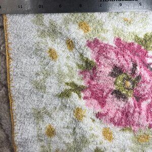 Bring a touch of cottage charm to your bath with this lovely vintage washcloth! Featuring a vibrant pink bloom, reminiscent of a delicate peony or rose, nestled among sweet daisies on a soft white background. A cheerful, sunny yellow trim adds a perfect pop of color. So charming and unique!