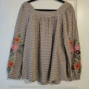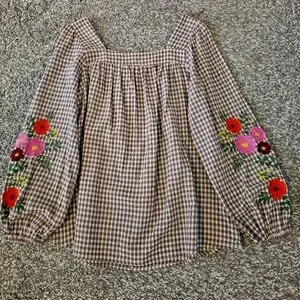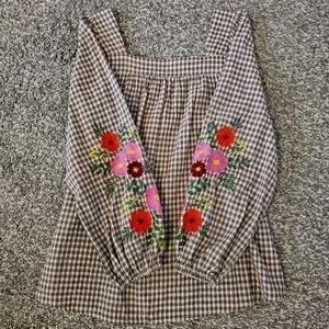Brown and White Plaid Square Neckline Top. Peasant Sleeves with Pink, Burgundy, Orange and Yellow Embroidered Flowers. Super Cute and Flowy. In Excellent Condition.
