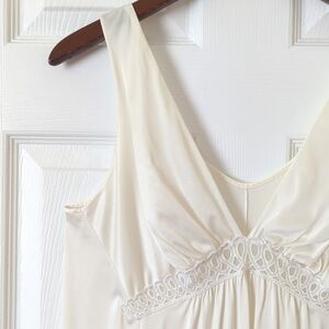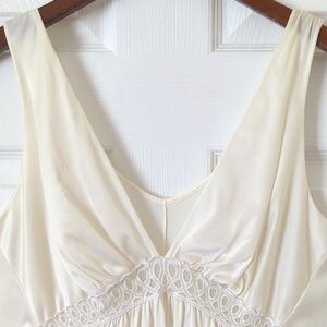 VTG and straight out of the 70s - This beautiful tank slip dress was made in the USA to feature a sleeveless silhouette with wide straps, a v-neck, and a subtle lace detail below the cups. It has a sheath cut, falling straight with a loose, relaxed fit and a midi length. It is ivory in color! The silky nylon is super soft, lightweight and breathable creating a flattering silhouette that is perfect for Spring and Summer. Great for warm weather! Very simple, classic, and elegant. Chic, retro and very high quality!
