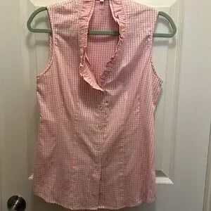 Tyler Boe sleeveless cotton blouse in a reverse check print features a ruffled neckline, formfitting darts and a button front. 100% cotton. EUC! Size 2. This top is gorgeous!
