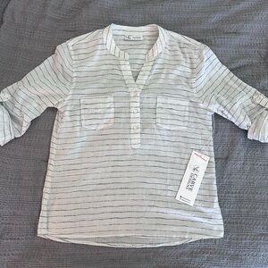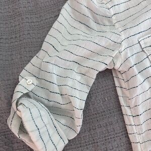 Casual button-down with subtle stripes. Features chest pockets and roll-up sleeves. Perfect for relaxed outings.