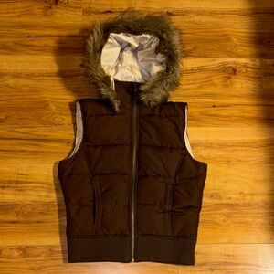 Vintage Y2K Aeropostale Brown Down Puffer Vest Removable Faux Fur Hood Sz Small