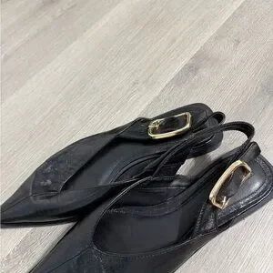 Elegant black flats with slingback design. Features a stylish buckle accent. Perfect for versatile wear.