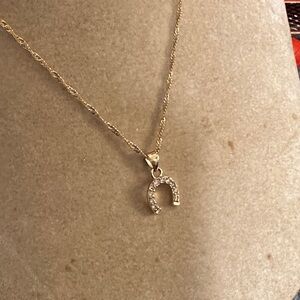 Elegant gold horseshoe pendant necklace, perfect for any occasion. Add a touch of luck and style to your outfit.