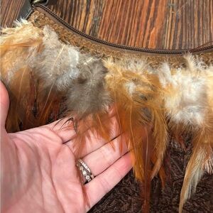 This Prezzo handbag features a brown leather and crushed velvet exterior with studded accents and feather details. It is a small-sized rectangle bag with a zip closure and brown leather top handle. The interior is lined with brown fabric and includes inner pockets. The hardware is gold-colored, giving the bag an elegant touch. This stylish accessory is perfect for travel, parties, or casual outings with a unique Italian and bohemian-inspired design.