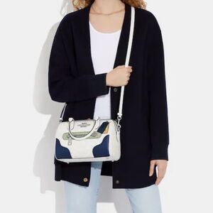 Chic Coach satchel with a white base, blue accents, and green detail. Ideal for stylish outings