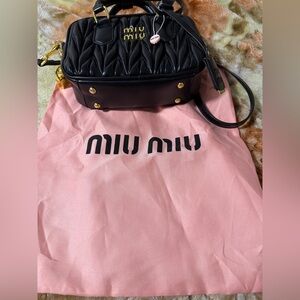 Stylish Miu Miu mini bag in black. Features a quilted pattern. Gold details enhance its elegance. authentic
