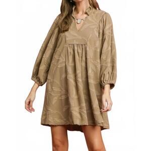 Experience the effortless elegance of the Umgee Jacquard High Ruffle Neck Dress, a perfect travel companion in a chic Mushroom shade. This mini dress features three-quarter puff sleeves and a ruffled high neckline with a stylish V-cut front. Fabricated from 100% Polyester, it boasts a subtle tonal leaf jacquard texture and a relaxed, flowy shift silhouette for boho chic flair. With a comfortable pull-on closure, this lightweight, breathable piece is ideal for summer days. Care: Machine wash and lay flat to dry.