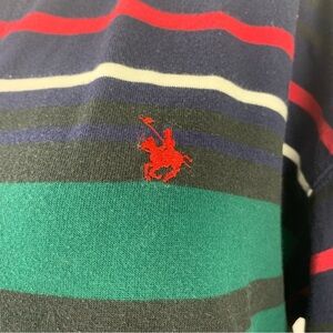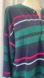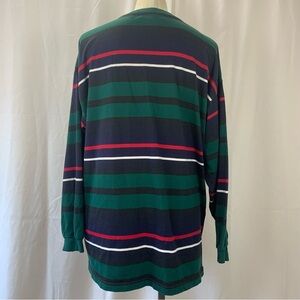 Vintage long sleeve Henley shirt with green, white, navy, and red stripes. Features classic button neckline.