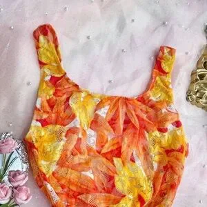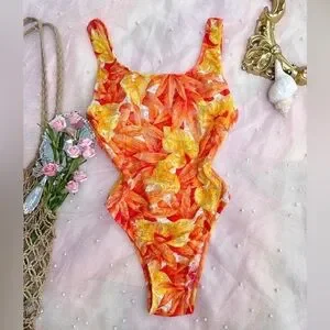 Bright and colorful one-piece swimsuit with a floral pattern. Features shades of red, orange, and yellow.