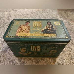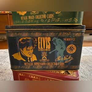 Set of three Elvis Gold collector card tins. Features green, blue, and red tins with gold accents.