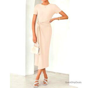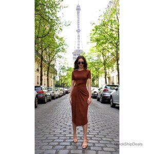 Brand new, never worn, and in flawless condition — this elegant midi dress delivers a tailored, alluring look perfect for cocktail parties, weddings, work events, or a special date night. The silhouette is ruched and figure-flattering, with a delicate metal waist buckle to accentuate your curves.