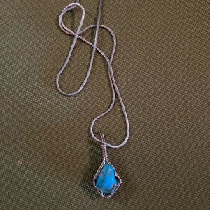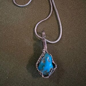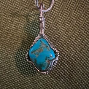 Vintage handcrafted silver necklace featuring a stunning turquoise pendant. Perfect for adding a pop of color to any outfit. Made in New Mexico over 35 years ago.