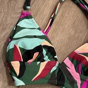 “A fashionable look with dramatic details, this chic mid-length bikini top from Hula Honey accents a vibrant tropical print with a cool strappy lace-up back.”- Macy’s website.