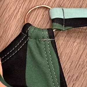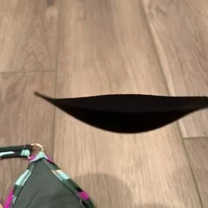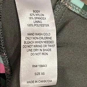 Removable/lightly padded cups; tie closure at back; adjustable double straps; V-neck; hardware detail at front straps; lined. Bottom bust band is quite stretchy and can stretch another couple of inches. Size listed is XS and Macy’s site says it’s a junior’s brand (according to UPC number).