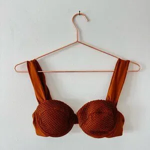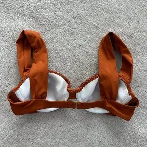 Super cool fashion-forward 70s-inspired bikini from We Wore What. Top is balconette with lightly padded cups, inch-wide straps, and adjustable back hook. Bottoms are high-waisted (over belly-button) and high cut (to hop bone) with cute belt. Only worn a few times, in great condition.