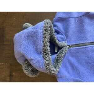 Soft purple fleece onesie designed for babies. Features a zip closure from neck to leg for easy dressing and changing. The hood is lined with cozy gray plush trim and adorned with cute bear ears. Full coverage with built-in footies to keep little feet warm. Sleeves can be rolled up and secured for comfort and flexibility. Ideal for keeping babies warm in cooler weather.
