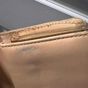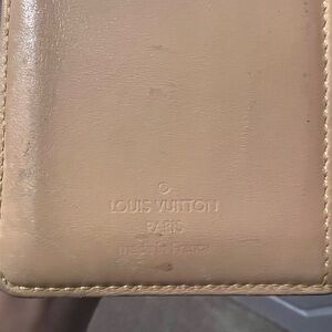 Chic wallet with vibrant monogram on black. Features a secure snap closure.