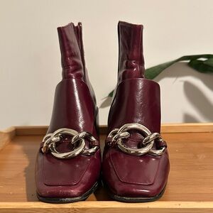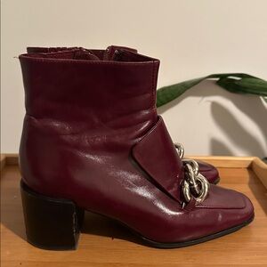 Step out in style with these elegant burgundy ankle boots. Featuring a striking silver chain detail, these boots are perfect for any occasion.