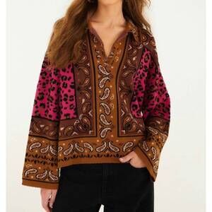 NEW FARM RIO scarf polo knit sweater in brown leopard