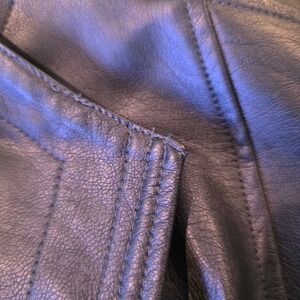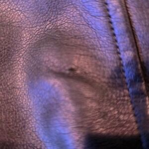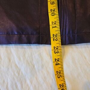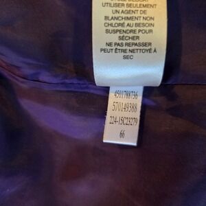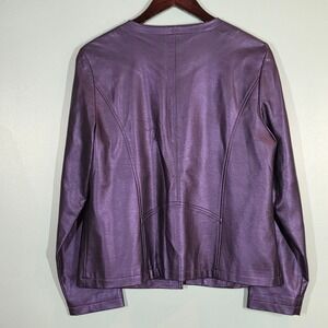 Chico's faux leather jacket in a striking metallic purple finish features a sleek open-front design with a collarless neckline. Crafted from a rayon base with a polyurethane coating, this lightweight layer offers a modern, edgy aesthetic with a smooth interior lining for comfort. The structured silhouette is complemented by vertical seam detailing and discreet side pockets, making it a versatile piece for elevating casual or professional ensembles. See photos for signs of wear.