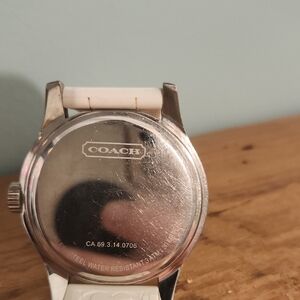 Elegant Coach watch featuring a cream band. Silver-tone case and dial with subtle patterns.