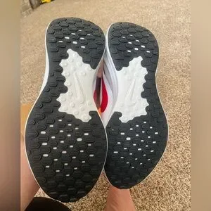 Sleek Nike running shoes in white with bold red swoosh. Ideal for athletic activities.
