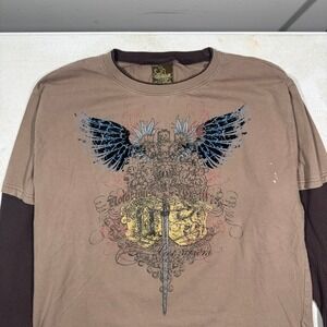 Notorious B.I.G. graphic t-shirt features a unique layered look with brown waffle-knit long sleeves attached to a tan short-sleeve body. The front showcases an intricate Y2K-style print with a central sword, wings, and heraldic imagery in black, blue, and yellow. Crafted from 100% cotton, this piece offers a comfortable relaxed fit and a vintage streetwear aesthetic. Note: There are a few small white paint or bleach-like spots on the front right chest area as shown in photos.
