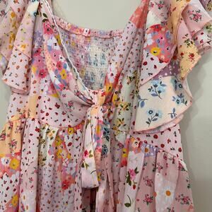 • SHEIN Curve 1XL pink patchwork floral babydoll dress with ruffle sleeves and smocked back