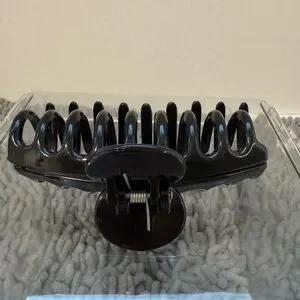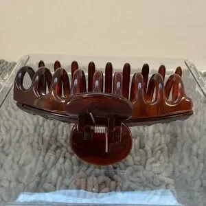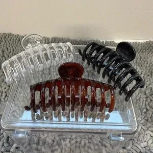 Stylish set of three hair claw clips. Includes black, brown, and clear colors. Perfect for versatile styling.