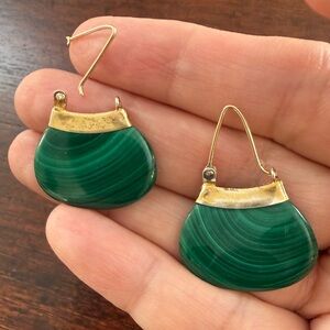 This an amazing pair of natural malachite gold plated sterling silver drop earrings. The malachite stones each have a unique pattern. They weigh 8.9 grams and are 1.25 inches long. One hoop has broken off its hinge and needs to be repaired. Your local jewelers can easily do it. This is reflected in the price.