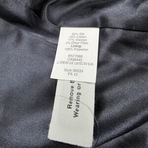 Pre-owned - Excellent Pre-owned J Crew silk blend tweed blazer with light overall wear and soft textured fabric. Hook-and-eye closures, shoulders, seams, cuffs, hem, and pockets are clean, secure, and free of stains, pulls, or holes. Interior lining is smooth, intact, and free of snags or tears.