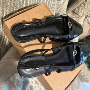Sleek black loafers with a glossy finish. Slingback design for a modern touch. Ideal for versatile styling.