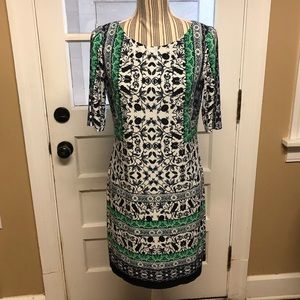 Vince Camuto green/navy print shift dress with elbow sleeves and back gold tone zipper entry. It’s possible that the navy is actually black. It is dark and reads navy to me but my husband thinks it’s black, so....