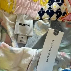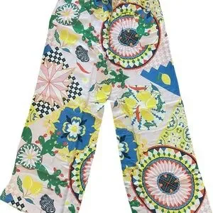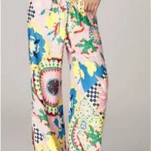 These Anthropologie wide leg pants feature a vibrant abstract design with splashes of yellow, blue, and green, complemented by geometric and medallion-like patterns. Crafted from lightweight, flowy fabric, they offer a relaxed fit perfect for warm weather and casual outings.