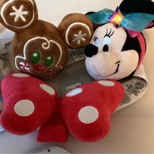 Charming Disney plush set with Minnie Mouse and gingerbread character. Features vibrant red, brown, and blue colors. Perfect for imaginative play. Aristocrat Marie Keychain or bag charm. 2 items are new with tag and the other two are NWOT. Excellent condition and use for create your own headbands or add to bags as farm.