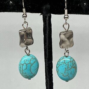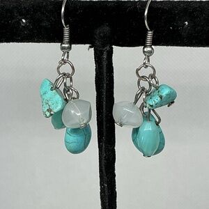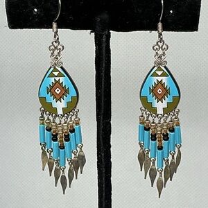 Vintage earrings lot featuring boho and Southwestern styles with turquoise-look beads, enamel geometric dangles, and fringe details. Includes mixed materials (glass, stone, enamel, metal) with fishhook back