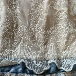 Embroidered lace, ruffles, tiered skirt, back zipper.